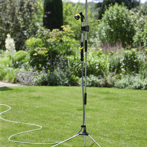 Съёмную штангу можно использовать для полива. Удобный душ для дачи. Установка занимает всего в течение 3 минуты. Оснащён треногой, пикой, съемным душем с широкой душевой струей и штангой для полива (2-в-1). Есть возможность регулирования высоты от 1,50 - 2,20 м. Преимуществом также является регулировка расхода воды и функция включения / выключения одной рукой. Не займет много места при хранении.