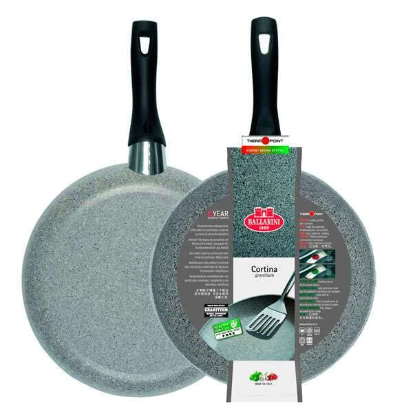 Сковорода Ballarini Cortina Granitium получила инновационное антипригарное покрытие, в состав которого входят микрочастицы гранита. Оно даёт возможность свести количество масла, использующегося в процессе приготовления, к минимуму. Благодаря этому еда получится особенно вкусной и здоровой, а после использования вы сможете легко и быстро отмыть посуду. Защитный слой сложно поцарапать, поэтому не страшно пользоваться даже металлическими лопатками, ножами и другими аксессуарами.