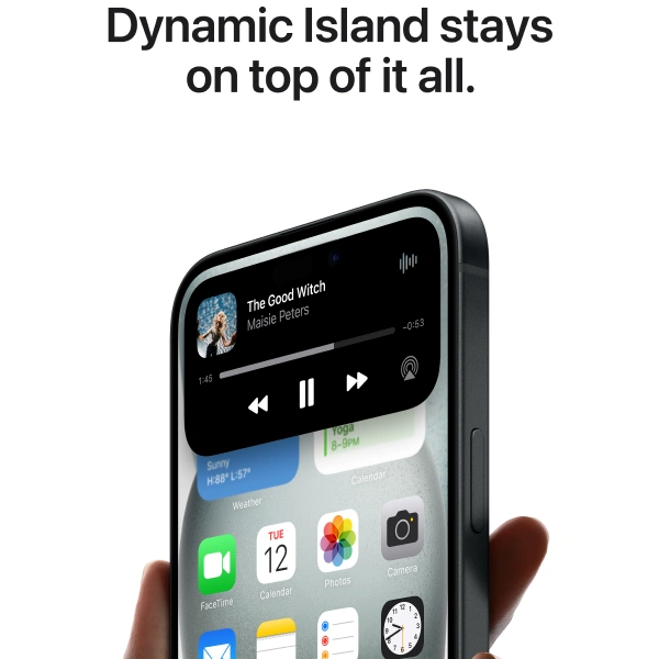 iPhone 15 с Dynamic Island, основной камерой 48 Мп и USB-C — в алюминиевом корпусе и с прочной задней панелью из насыщенного цветом стекла.