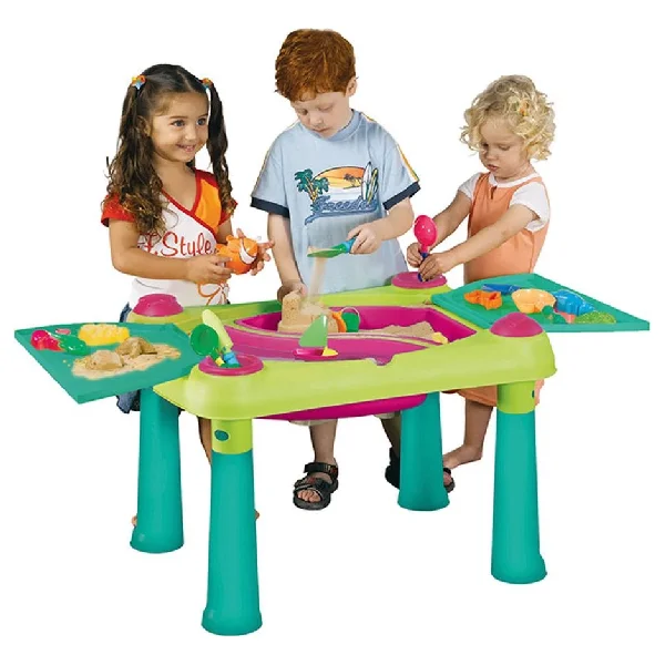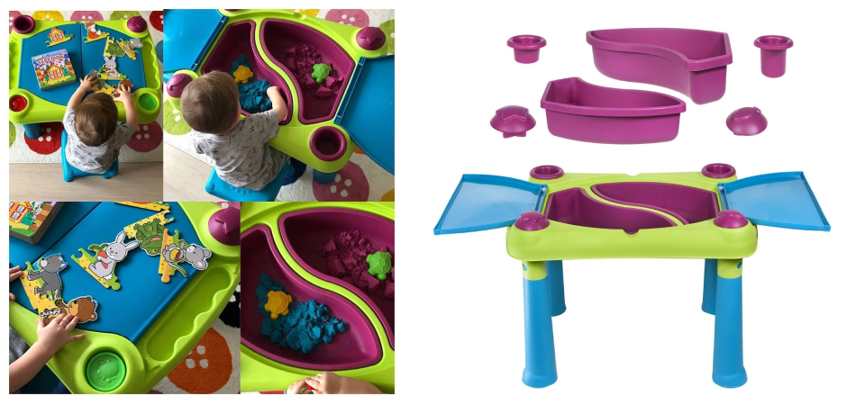 Столик для детского творчества. Столик для игр с песком и водой - подходит для игр целой компанией. Столик для творчества Keter Creative Play Table — яркий и удобный, обязательно понравится Вашим детям. В комплект входят столик, две съемные чаши (для легкой очистки) объемом до 15 литров воды, два съемных контейнера для хранения и две формочки для песка. Столик имеет две откидные крышки, которые прекрасно защищают песок и воду от пыли и ветра в раскрытом состоянии откидные крышки служат столешницами.