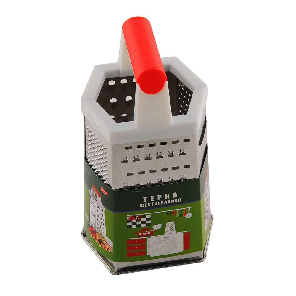 Для приготовления горячих блюд, салатов, закусок, украшения выпечки и кондитерских изделий очень часто нужно измельчить ингредиенты. Шестигранная терка – удобное кухонное приспособление с отверстиями и насечками шести типов: мелкая и средняя терки, крупная терка, шинковка, фигурная шинковка и шредер. Пользоваться изделием легко: поставьте терку на стол, одной рукой держите за ручку. Второй рукой возьмите продукт, прижмите к нужной вам грани и начинайте тереть, направляя движения вниз. Натирайте только крупные части, чтобы не повредить пальцы. Рабочая поверхность выполнена из коррозионностойкой стали, ручка – из пластмассы, высота изделия 22 см. Уход за изделием прост: после использования промывайте водой, удаляя щеткой остатки пищи.