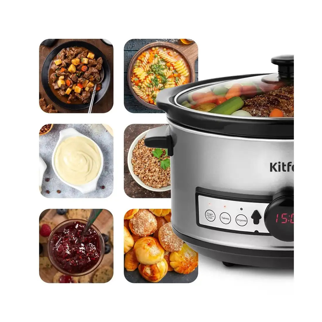 Медленноварка Kitfort КТ-212 готовит блюда особым способом – томлением. Температура лежит в диапазоне 60-120° C. Этот способ идеален для блюд длительного приготовления, как каши, рагу, жаркое, варенье, плов, выпечка, топлёное и сгущённое молоко и др.