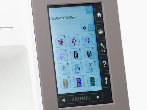 Управление машиной осуществляется на цветном сенсорном дисплее, на котором вы можете видеть образцы дизайнов вышивки, различные параметры и рекомендации, а также при необходимости изменять настройки.