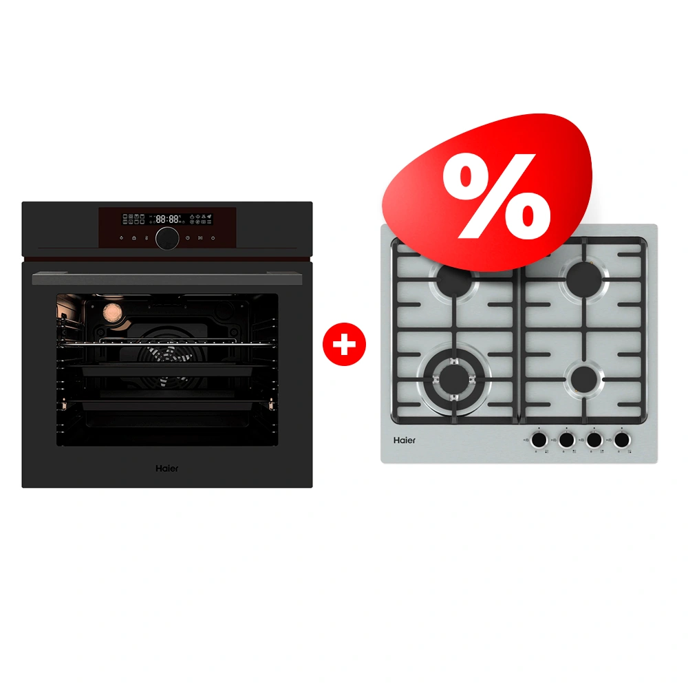 Комплект Встраиваемый духовой шкаф Haier HOX-FP5AGG + Газовая варочная поверхность Haier HHX-M64CWFX