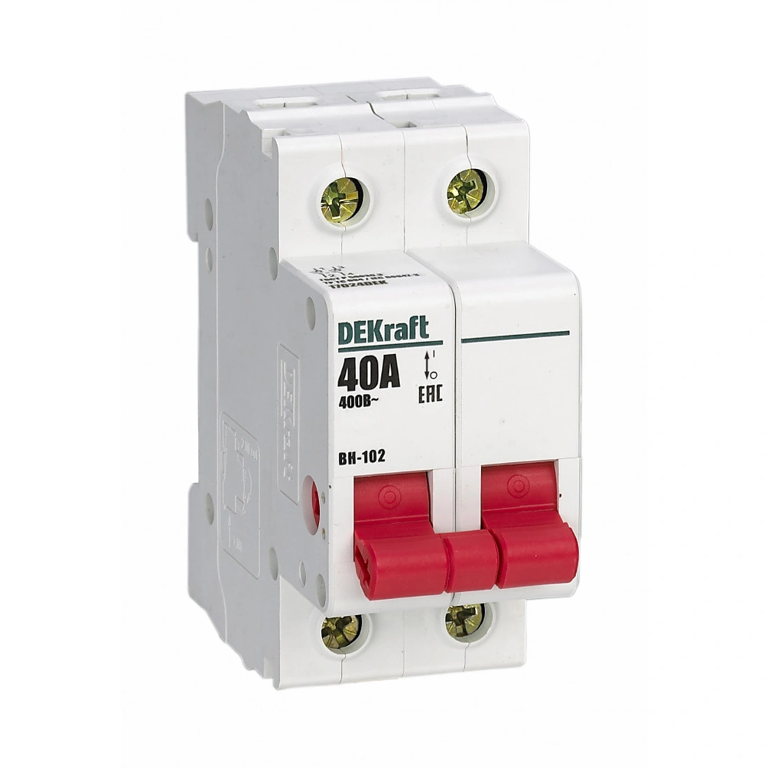 Выключатели нагрузки DEKraft 17024DEK ВН-102 2Р 40А Выключатель-разъединитель серии ВН-102 DEKraft; 2P; номинальный ток 40 А; установка – на DIN-рейку; установочное положение - любое. Выключатели-разъединители применяются для ручного включения/отключения сетей напряжением до 400 В. Специальные мостиковые контакты обеспечивают надежный разрыв цепи; они полностью исключают возможность перекрытия дугой по изоляции. Усиленная рукоятка управления обеспечивает большое количество включений/отключений.