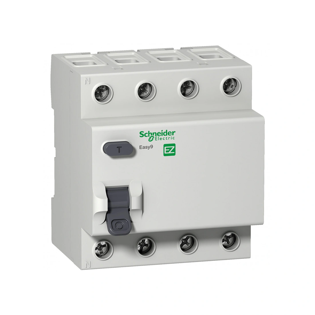 Выключатель дифференциального тока SE 4P 25А 30мА Выключатель дифференциального тока (ВДТ) или устройство защитного отключения (УЗО) серии Easy9 Schneider Electric, 4-полюсный, номинальный ток 25А, ток утечки 30 мА, тип АС, ширина 4х18 мм. - Применяется в трехфазных сетях напряжением до 400 В. - Установка по току утечки 30 мА обеспечивает гарантированную защиту людей при прямом прикосновении. - Кнопка тестирования работоспособности аппарата. - Крепление защёлкиванием на DIN-рейке шириной 35 мм.