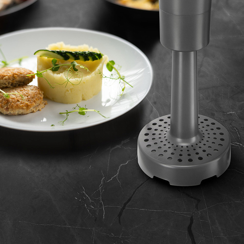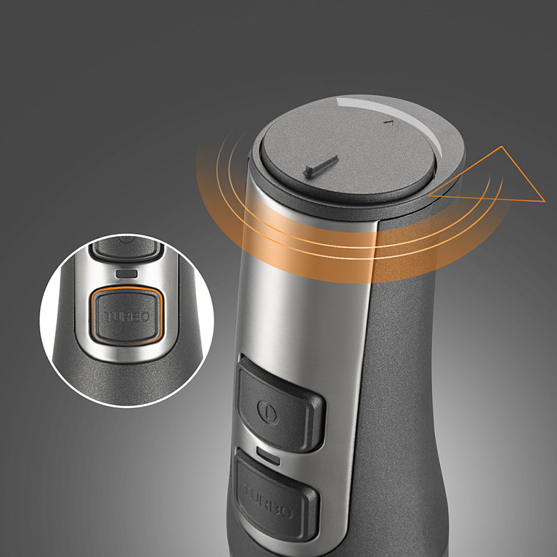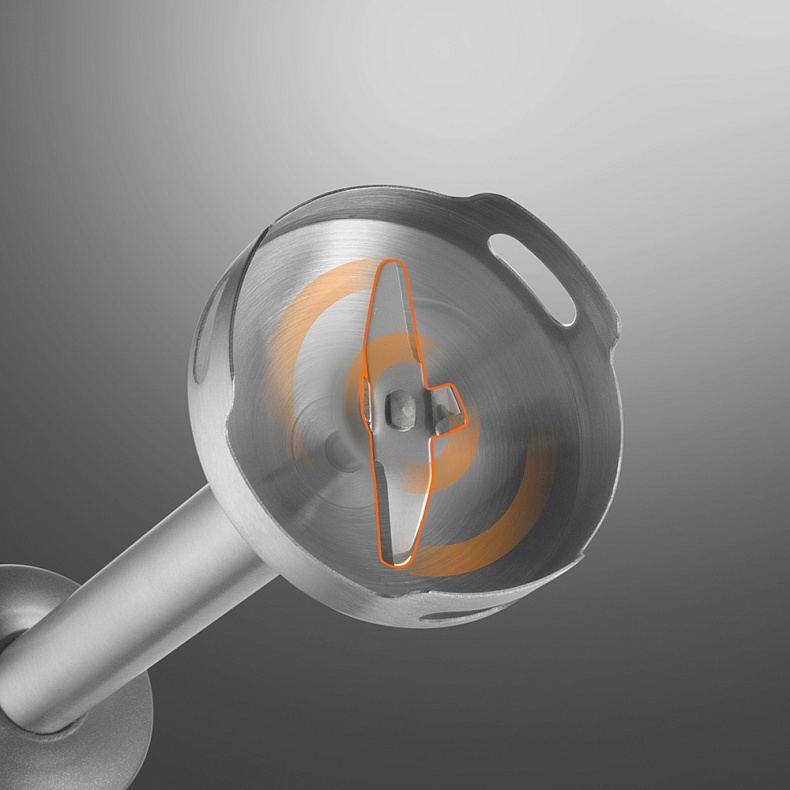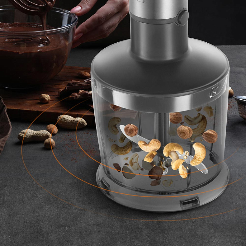 Плавное изменение скорости от 7250 до 10 250 оборотов в минуту, турборежим - до 15 000 оборотов в минуту. В комплекте 4 насадки: блендер, миксер, чаша-измельчитель, насадка для пюре. Двойная защита двигателя при перегреве или чрезмерной нагрузке мотора.
