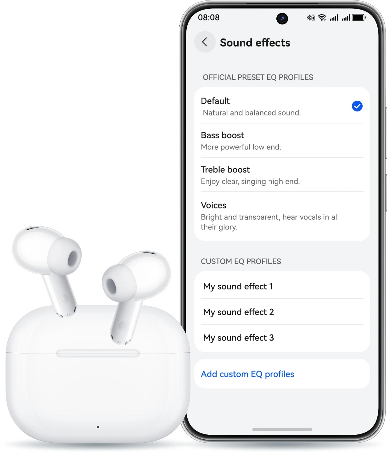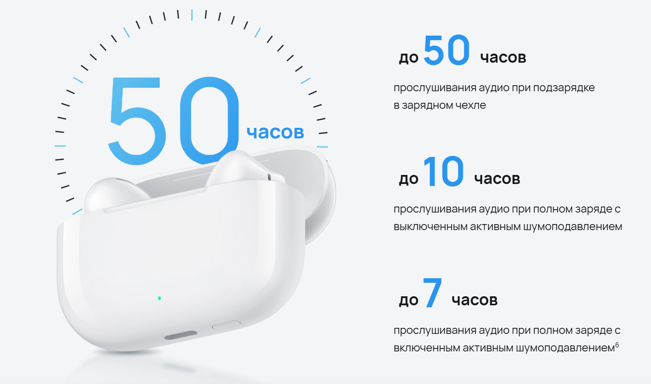 6. Батареяның жұмыс уақыты туралы деректер Huawei зертханасында жүргізілген сынақтардың нәтижесінде алынды, онда AAC форматындағы аудио қолданылды, дыбыс деңгейі 50% болды, жел шуын басу режимі өшірілді, белсенді шуды басу қосылды, құлаққаптар HUAWEI Pura 70 смартфонына қосылды. Басқа функциялар үшін әдепкі баптаулар қолданылды. Батареяның нақты жұмыс уақыты дыбыс деңгейіне, аудио дереккөзіне, кедергі деңгейіне, құрылғы баптауларына және пайдалану ерекшеліктеріне байланысты.