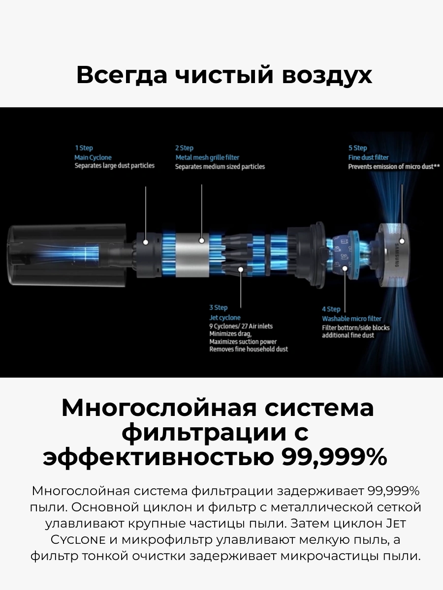 Samsung Jet™ 75 VS20B75ADR5/EV пылесосының негізгі артықшылықтары: көпфункционалдылығы, жеңілдігі, қуаттылығы және ыңғайлы трансформациясы. Ол вертикалды және қол пылесос ретінде қолдануға болады, бұл тазалауды жеңілдетеді. Батарея ұзақ уақыт жұмыс істейді, ал ауыстырылатын аксессуарлар тазалауды ыңғайлы етеді.